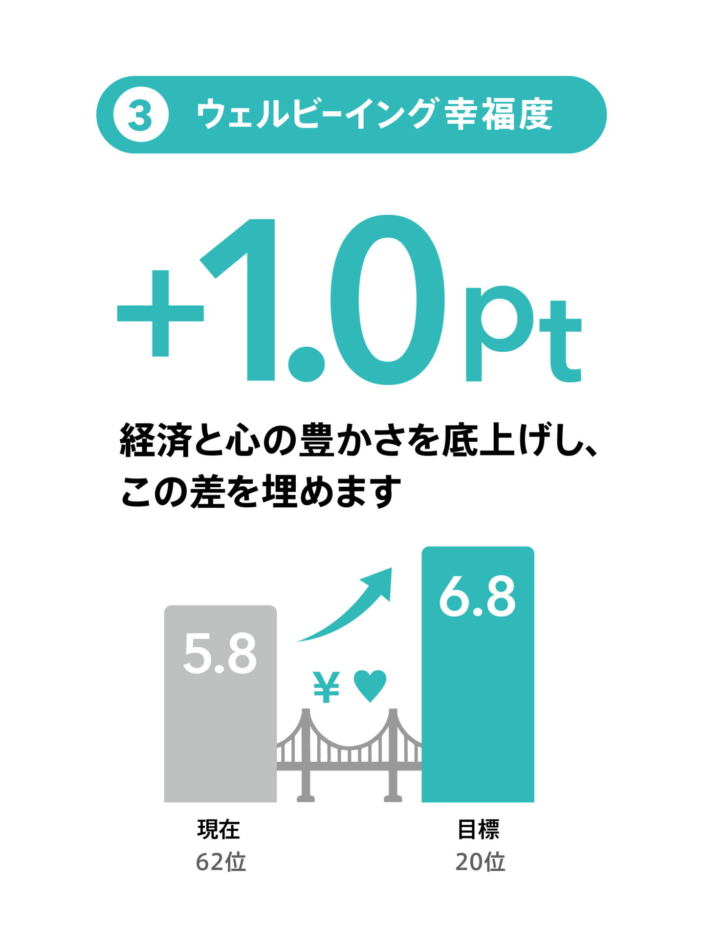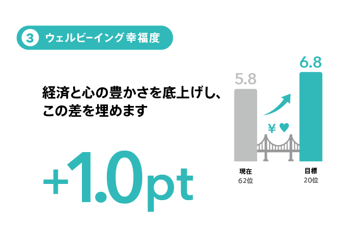 目指すのは、日本の幸福度を世界20位へ引き上げること。